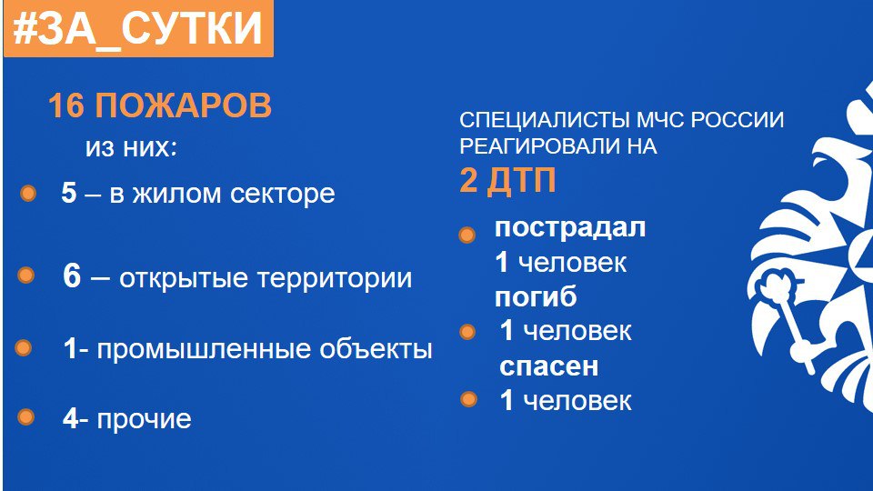 МЧС России: за прошедшие сутки ликвидированы 16 пожаров
