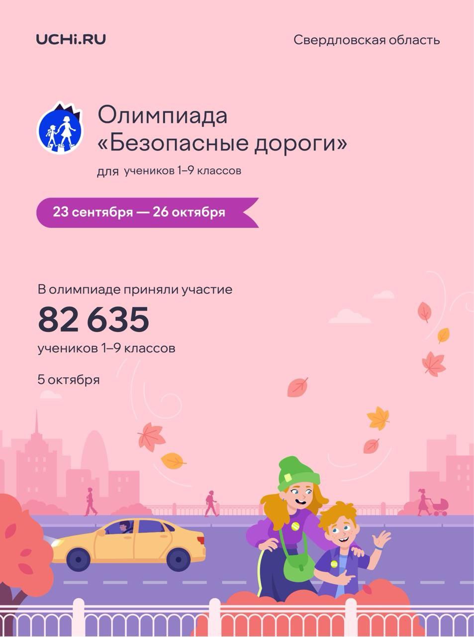 Уже более 82 635 школьников и дошколят Свердловской област присоединились к Всероссийской олимпиаде «Безопасные дороги» на платформе Учи.ру!