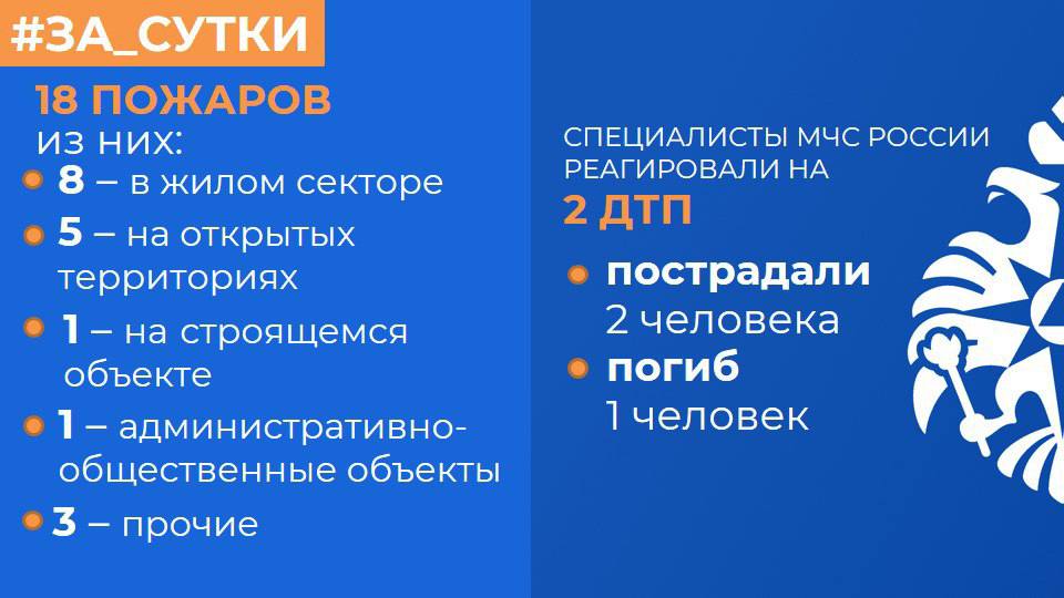 МЧС России: за прошедшие сутки ликвидированы 18 пожаров