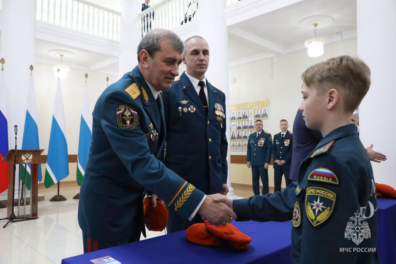В знак преемственности поколений учащимся 5-го кадетского класса лицея №180 «Полифорум» были вручены береты и удостоверения кадета — важный ритуал, знаменующий начало пути в профессии спасателя.