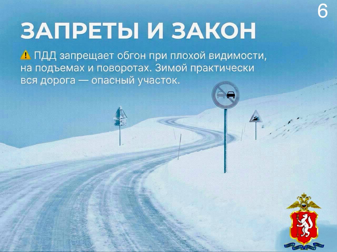 Закон суров и точен. Пункт 11.4 ПДД РФ запрещает обгон в конце подъёма, на опасных поворотах и в местах с ограниченной видимостью. Зимой из-за погодных условий почти вся дорога попадает под это определение.