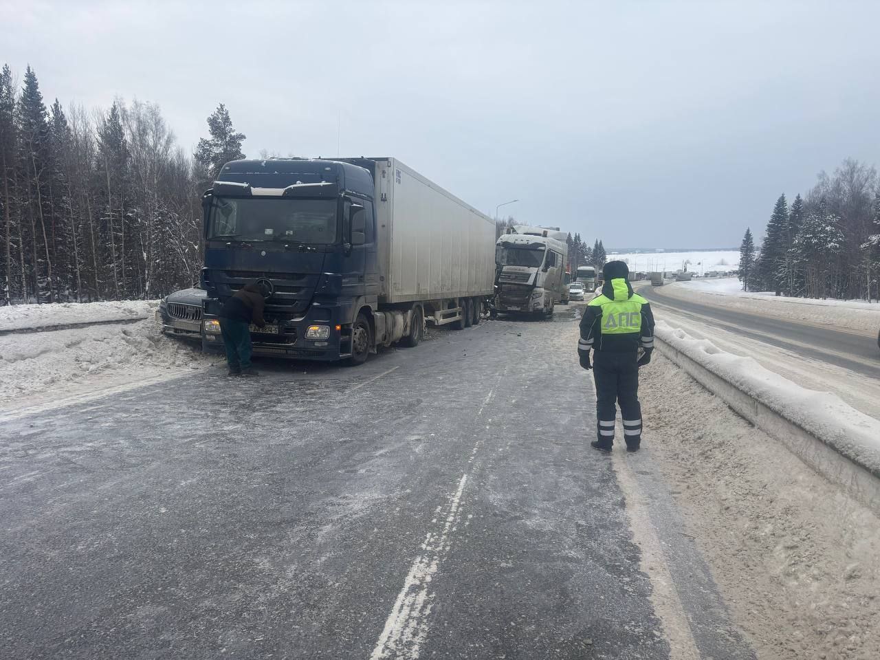 По предварительным данным на данном участке произошло столкновение трёх автомобилей, два из которых грузовые. Пострадавших нет.