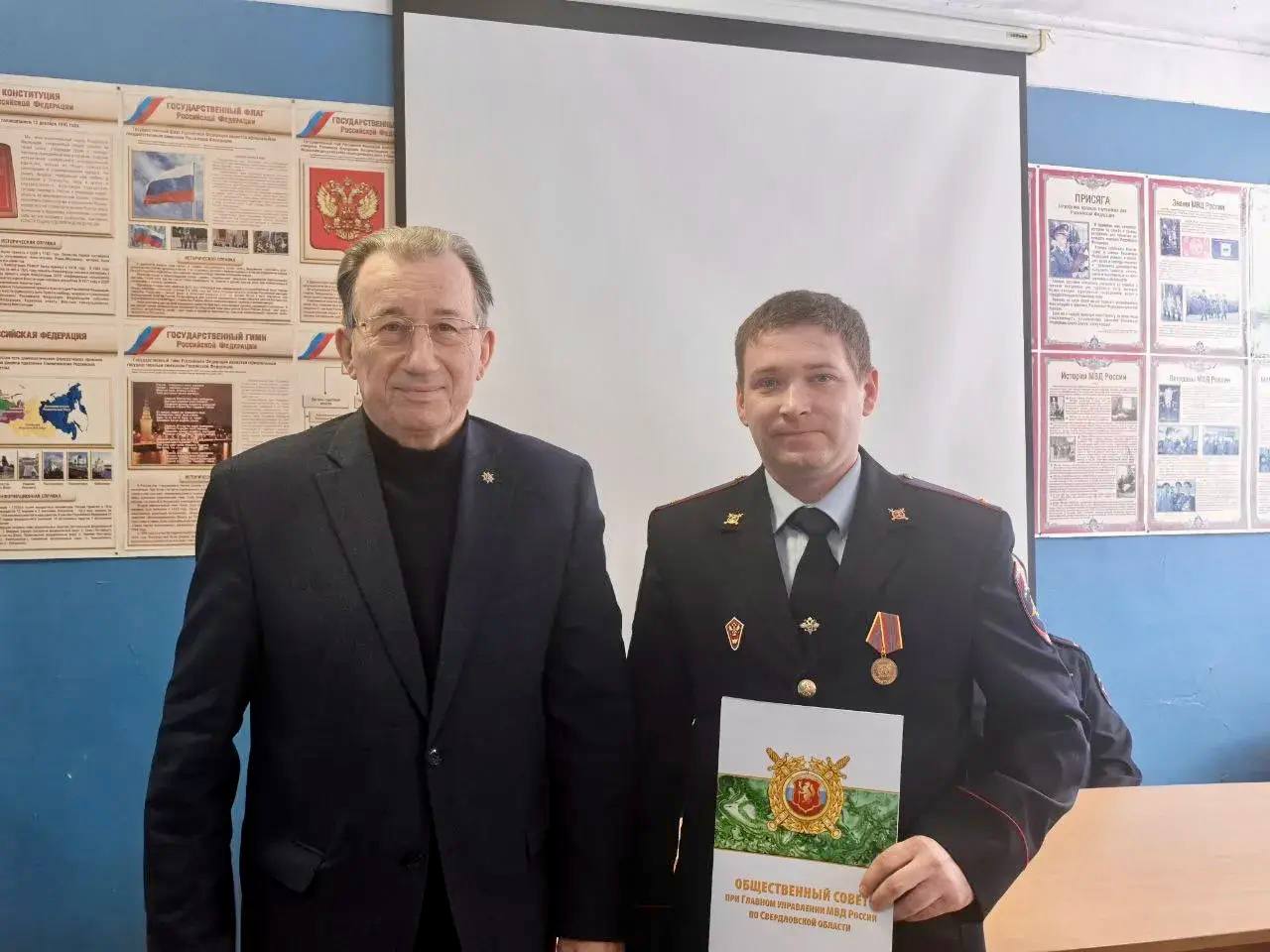 Награждение прошло в торжественной обстановке в Муниципальном отделе МВД России Шалинский. Руководители Общественного совета Владимир Красильников и Алексей Новосёлов вручили капитану полиции Анатолию Бурцеву и лейтенанту полиции Никите Гордееву благодарственные письма и памятные сувениры.