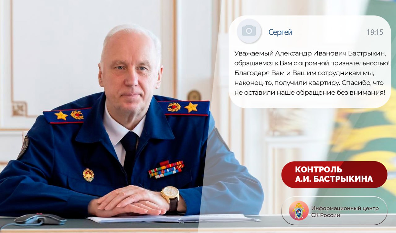 Уважаемый Александр Иванович Бастрыкин, обращаемся к Вам с огромной признательностью! Благодаря Вам и Вашим сотрудникам мы, наконец-то, получили квартиру. Спасибо, что не оставили наше обращение без внимания.