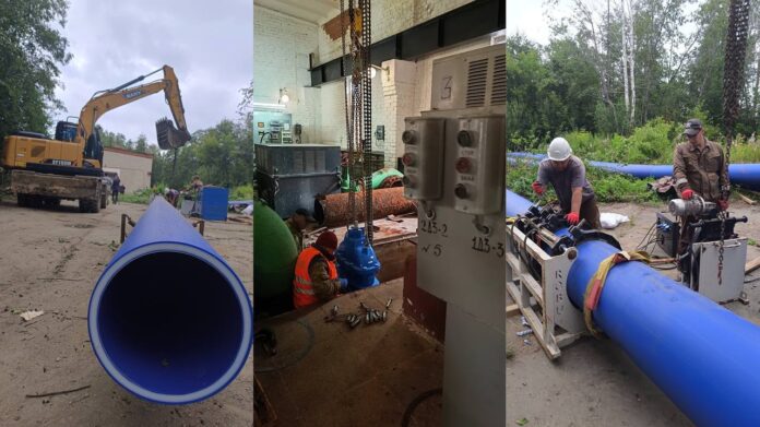 Трубопровод диаметром 500 и 600 мм протяженностью 1 700 м полностью реконструирован. Рабочие заменили старые ветхие трубы на долговечный пластик. Сейчас они завершают подсоединение вновь проложенных веток трубопровода к насосной станции.
