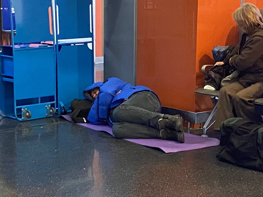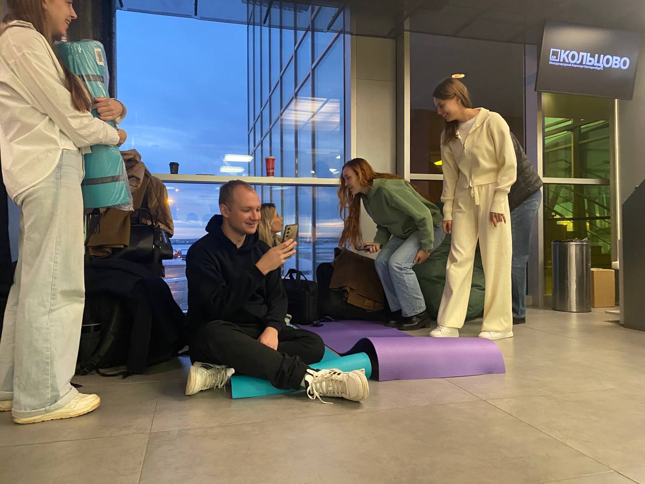 Пассажирам, ожидающим свои рейсы, сотрудники Кольцово выдают надувные диваны и коврики