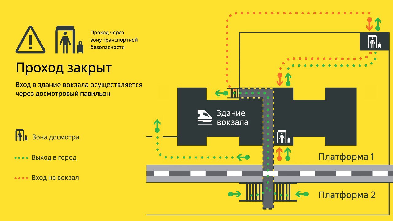 В соответствии с требованиями безопасности, проход на территорию вокзального комплекса и выход на платформы к поездам будет осуществляться только через досмотровый павильон с обязательным прохождением досмотра.