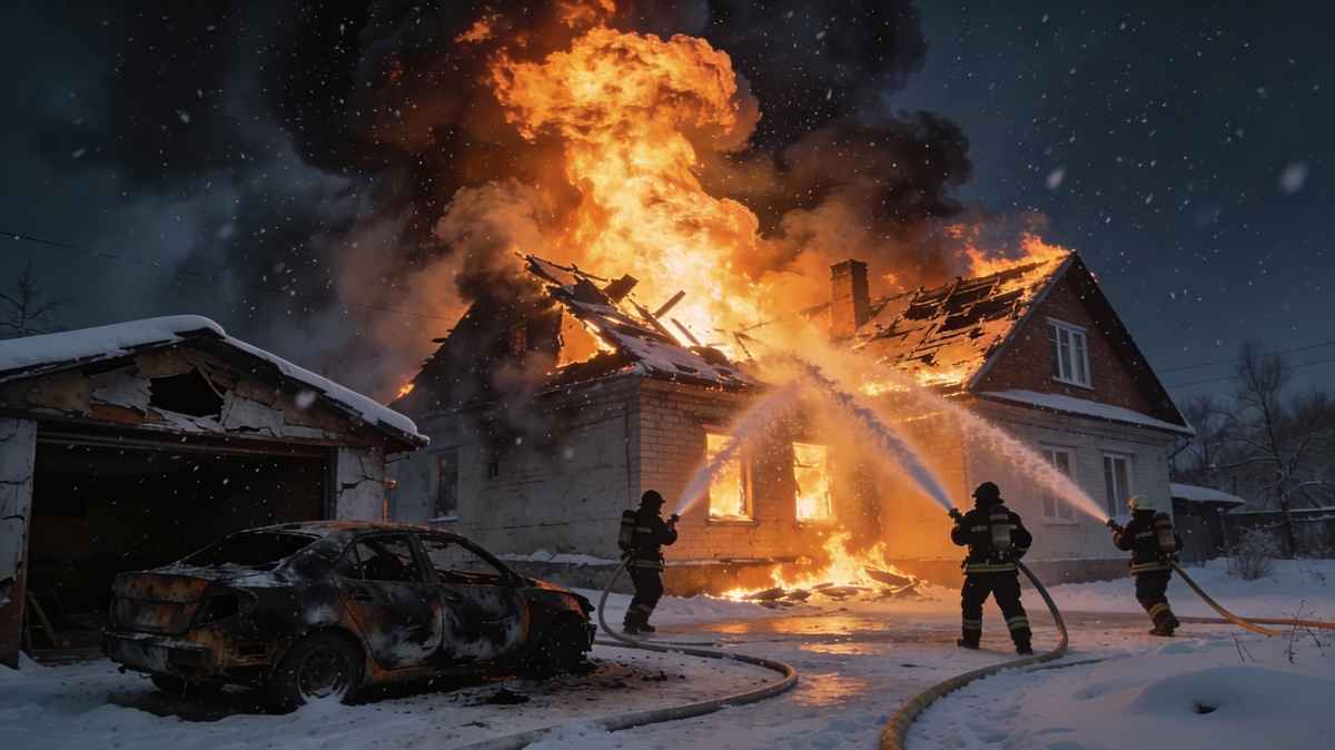 В Каменске-Уральском ранним утром 20 декабря крупный пожар уничтожил кровлю двухквартирного дома и полностью сжёг автомобиль. Огонь охватил площадь в 240 квадратных метров, повредив стены, надворные постройки и гараж.