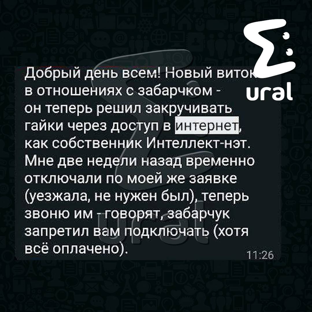 Мы уже писали о конфликте людей с вип-соседями из-за ворот и забора вокруг озера. Теперь другая проблема: по словам местных (тут и далее), активистам отрубают интернет, когда градус в переписке с УК сильно поднимается. Управляшке как раз принадлежит местный провайдер — "Интеллект.Нэт". Звонки на горячую линию и официальные обращения на почту не помогали.