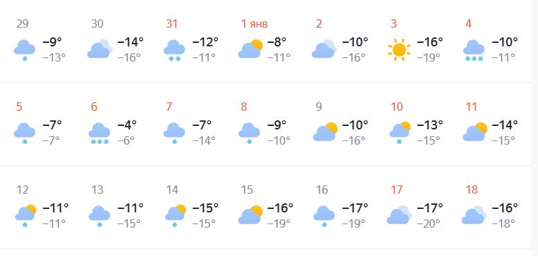 Судя по прогнозу Яндекс.Погоды, морозов в праздники не ожидается. Самым холодным днем будет 3 января - ночью столбики термометров опустятся до -19 градусов, днем потеплеет до -16.