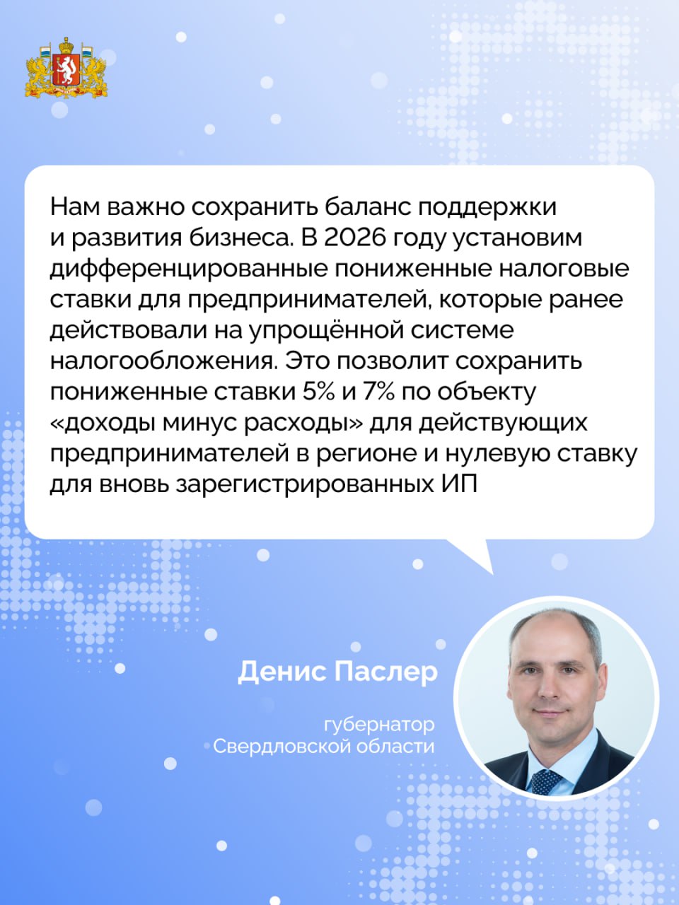 Денис Паслер поручил подготовить поправки в региональный законопроект по УСН для сохранения условий налогообложения предпринимателей Свердловской области
