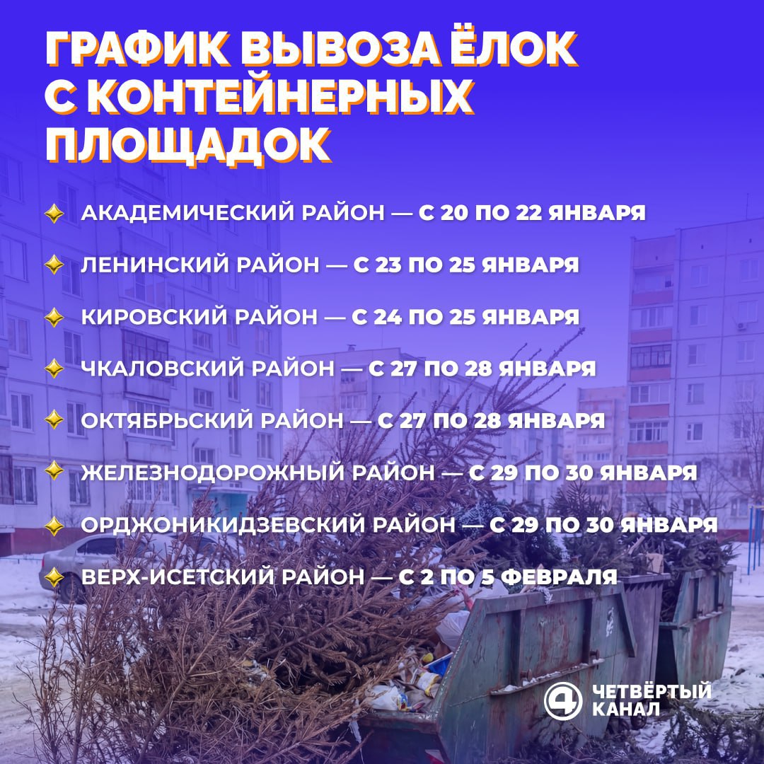 Академический — с 20 по 22 января, Ленинский — с 23 по 25, Кировский — с 24 по 25. В Чкаловском и Октябрьском ёлки заберут с 27 по 28 января, в Железнодорожном и Орджоникидзевском — с 29 по 30. Верх-Исетский район завершит акцию с 2 по 5 февраля.