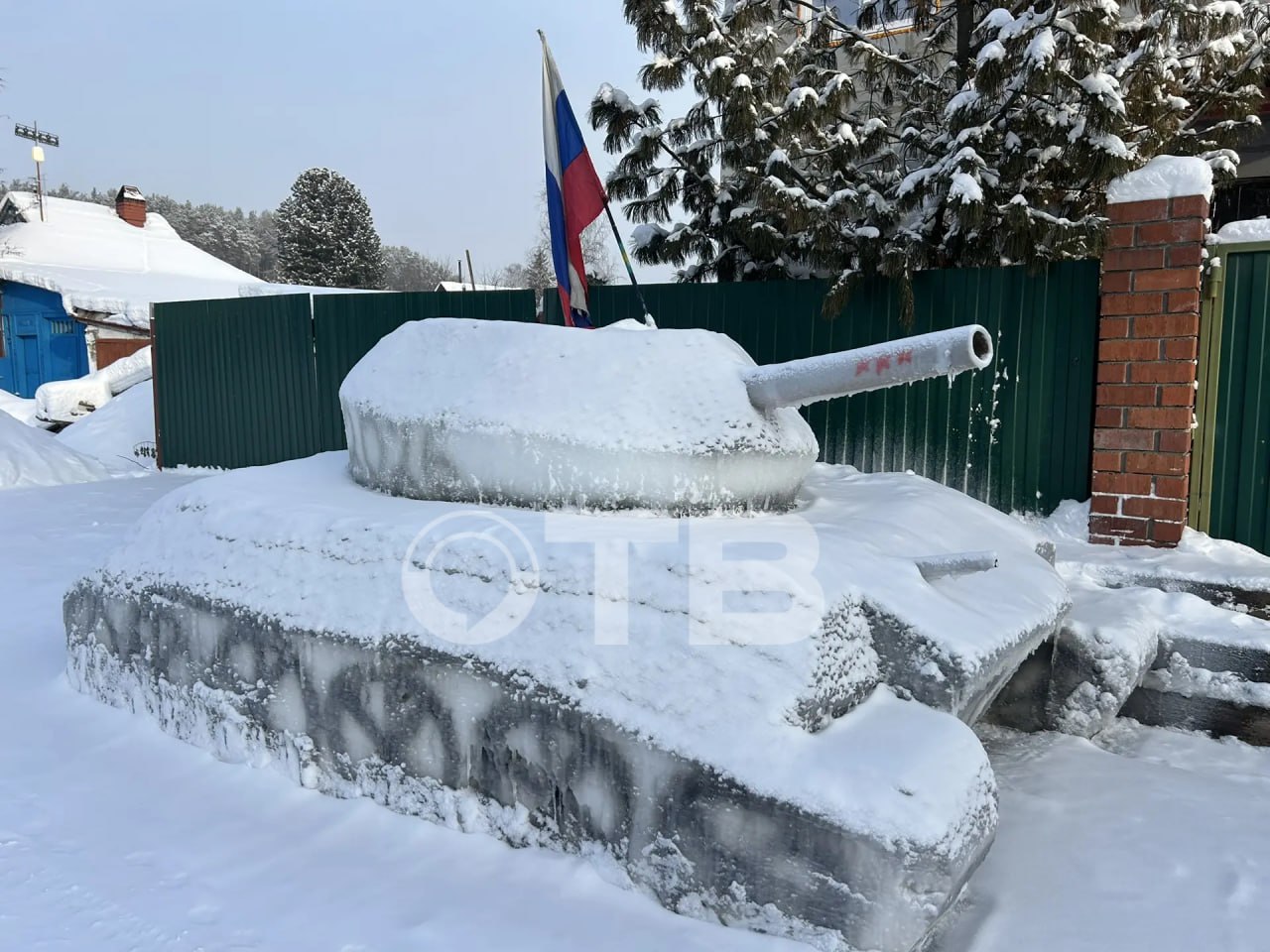 Боевая машина не настоящая - из снега. Мужчина строил его три дня вместе с товарищами в поселке Шувакиш из сугроба.