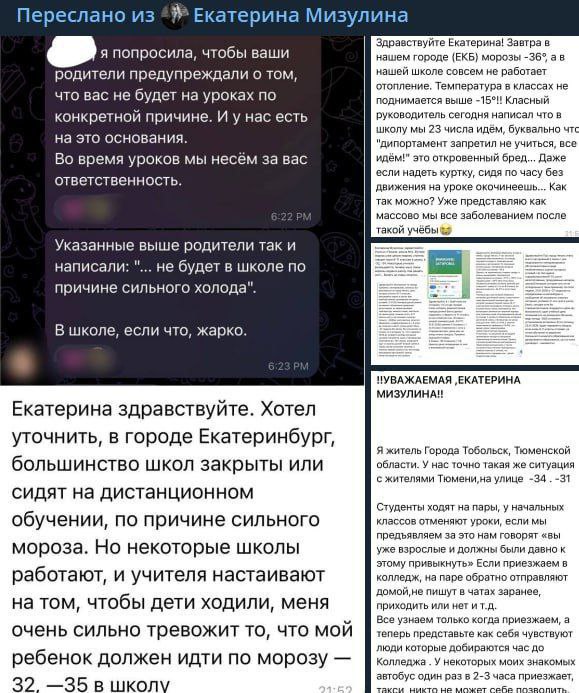 Родители написали директору Лиги безопасного интернета Екатерине Мизулиной, отметив, что уже несколько школ перешли на дистант из-за непогоды. Тем не менее в других учебных учреждениях детей, по их словам, заставляют идти на уроки.