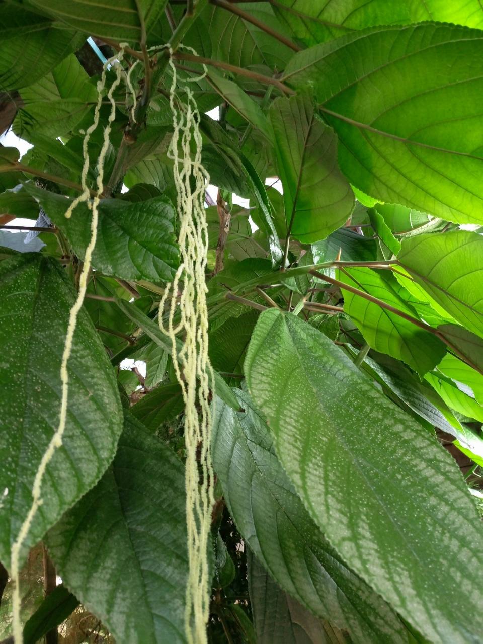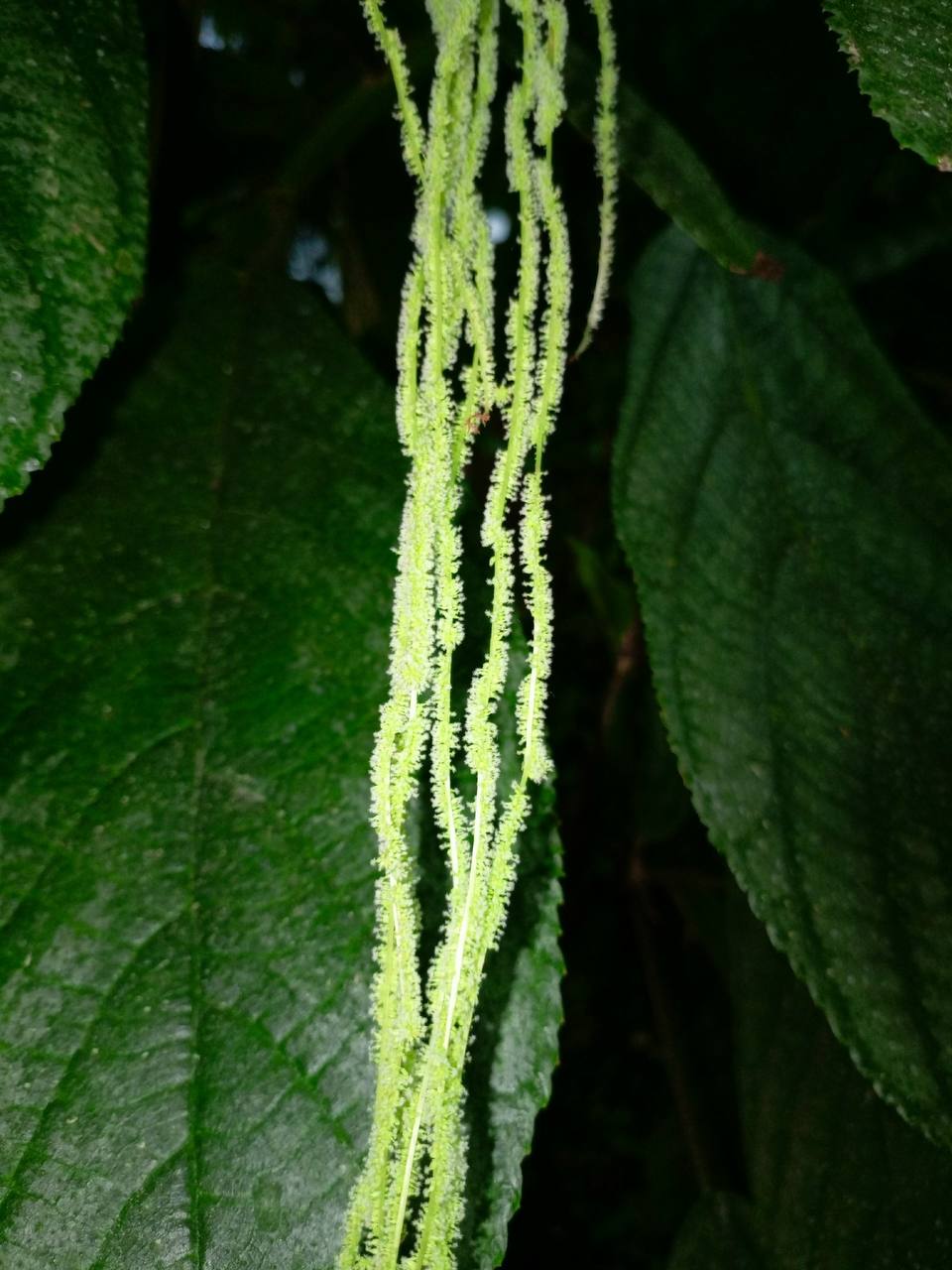 Это Мириокарпа стебельчатая. Родовое название «Myriocarpa» переводится как «бесчисленные плоды». Цветы её собраны в длинные поникающие соцветия-серёжки с мельчайшими цветками, а затем и плодами.