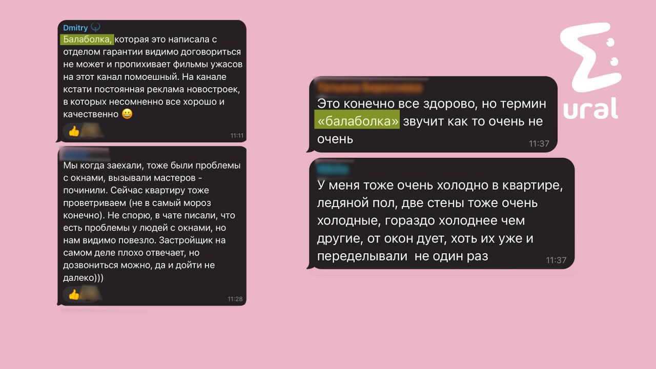 В разговоре с Ural Mash Дмитрий признал, что 10-15 квартир, где с окнами беда, в доме всё-таки есть. Заверил нас, что дозвониться до застройщика можно, но у того не хватает ресурсов, чтобы решить проблему, поэтому жителям надо разбираться самим. Мы снова набрали "Формуле строительства" (перед звонком на всякий проверили баланс), прождали около пяти минут, и нам наконец ответили. После вопроса про окна сбросили и не берут трубку уже 15 минут.