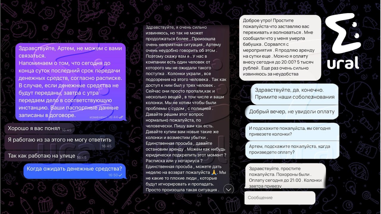 Люди сами обратились к нам и рассказали, что все подозреваемые работали по одной и той же схеме. Обычно приезжают 3–4 человека, забирают аппаратуру в аренду, а потом начинают тянуть сроки и перестают выходить на связь. Своё тусовочное имущество владельцы ищут в ломбардах и комиссионках. Один раз даже смогли отыскать похожий лот, но не успели выкупить.