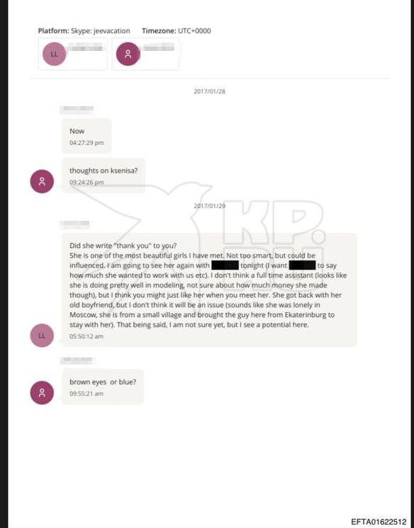В опубликованных документах просочилась личная переписка Эпштейна от 28 января 2017 года. В ней бизнесмен обсуждает с некой Ланой девушку Ксению, которая переехала из Екатеринбурга в Москву вместе со своим молодым человеком.