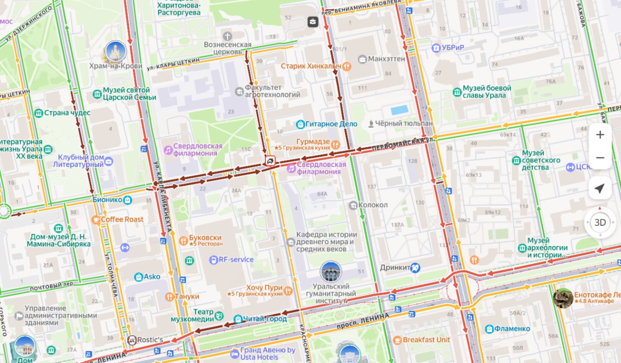По данным Яндекс.Карт пробки сейчас в Екатеринбурге достигают семи баллов.