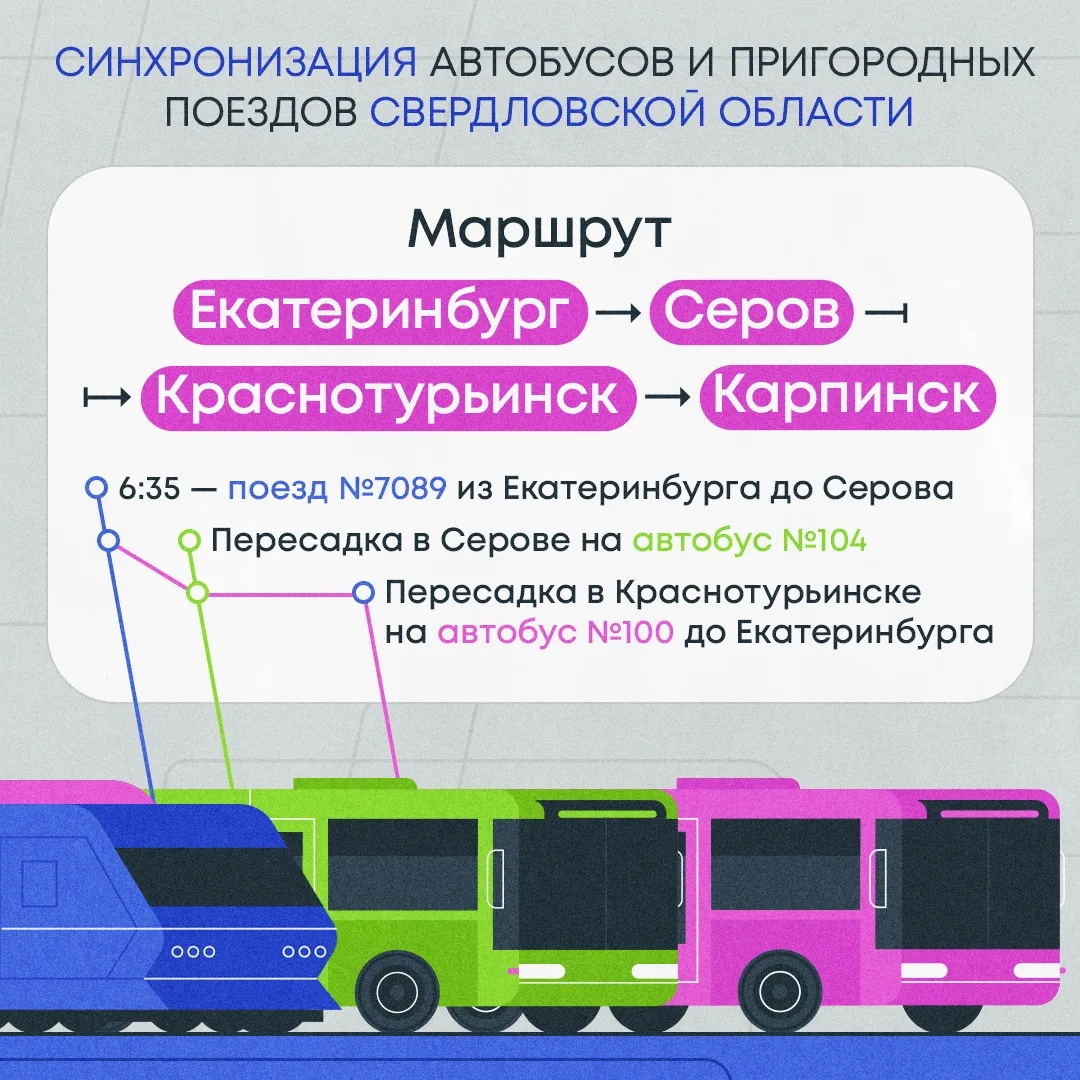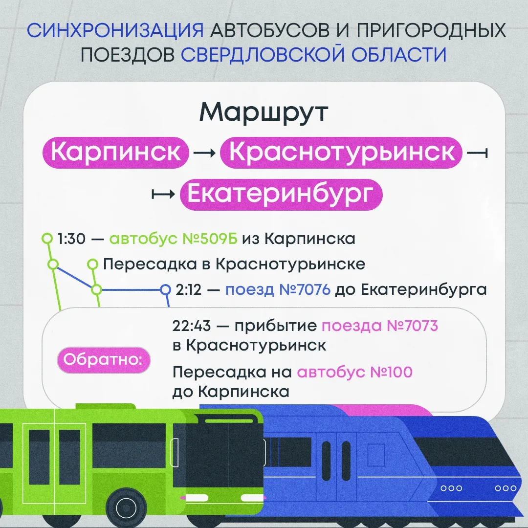 Министерство транспорта скорректировало расписание автобусов на севере региона для стыковки с поездами. Это поможет жителям северных территорий выстраивать непрерывные поездки до Екатеринбурга и обратно с минимальным временем ожидания.