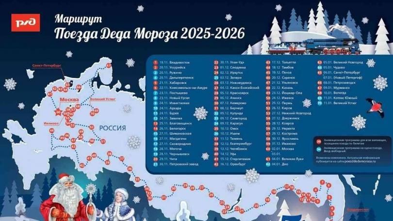 Главный новогодний волшебник уже готов к встречам с детьми и взрослыми по всей стране — его фирменный поезд снова выйдет на маршрут. Турне стартует 19 ноября во Владивостоке и завершится 11 января в Великом Устюге, где живёт сам Дед Мороз.В этом...