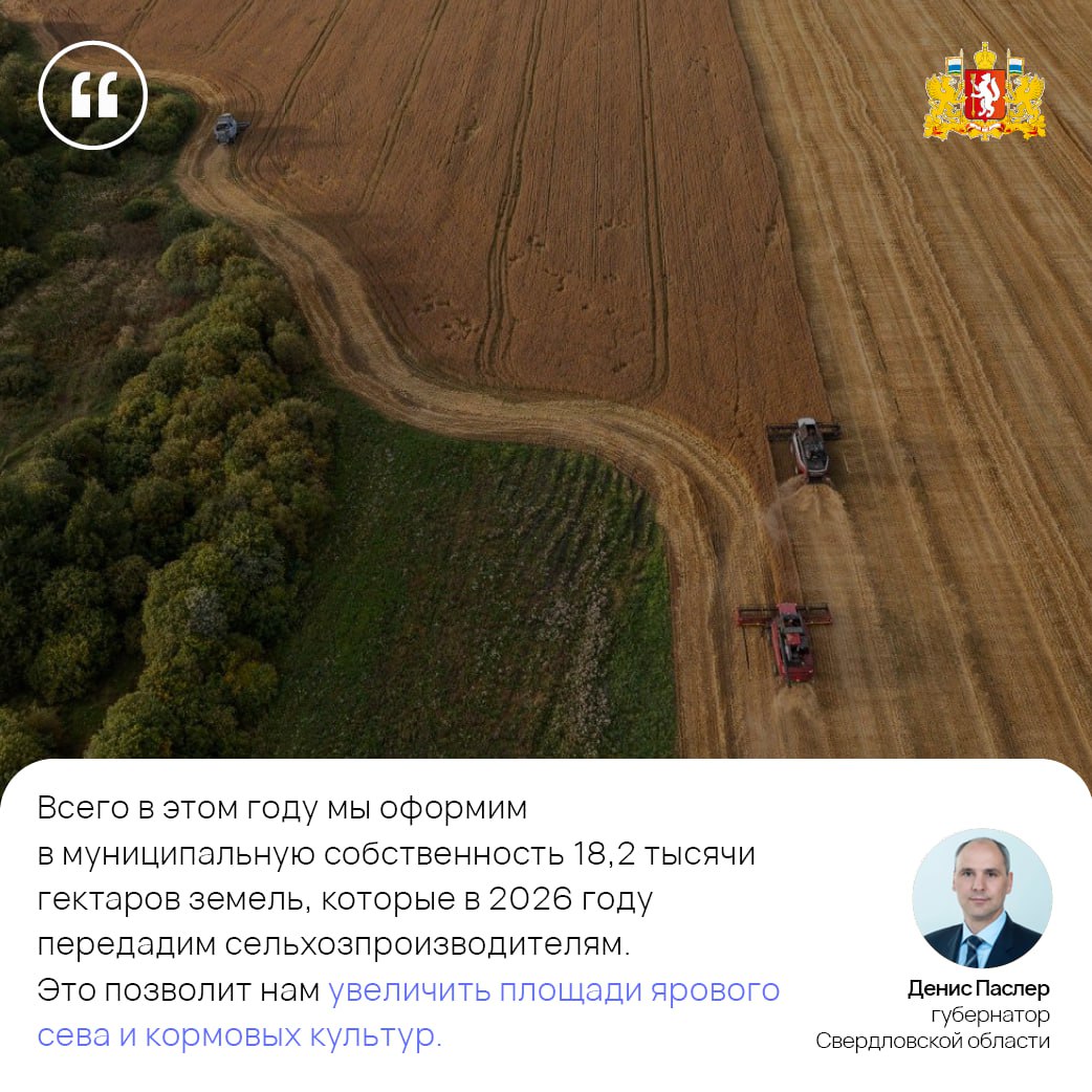 «Суммарно в Бисертском, Верхотурском муниципальных округах, Махнёвском муниципальном образовании, Слободо-Туринском муниципальном районе и Слободо-Туринское сельском поселении дополнительно введут в оборот 2,6 тысячи гектаров земель сельскохозяйственного назначения. Всего в этом году мы оформим в муниципальную собственность 18,2 тысячи гектаров земель, которые в 2026 году передадим сельхозпроизводителям. Это позволит нам увеличить площади ярового сева и кормовых культур», – сказал Денис Паслер.