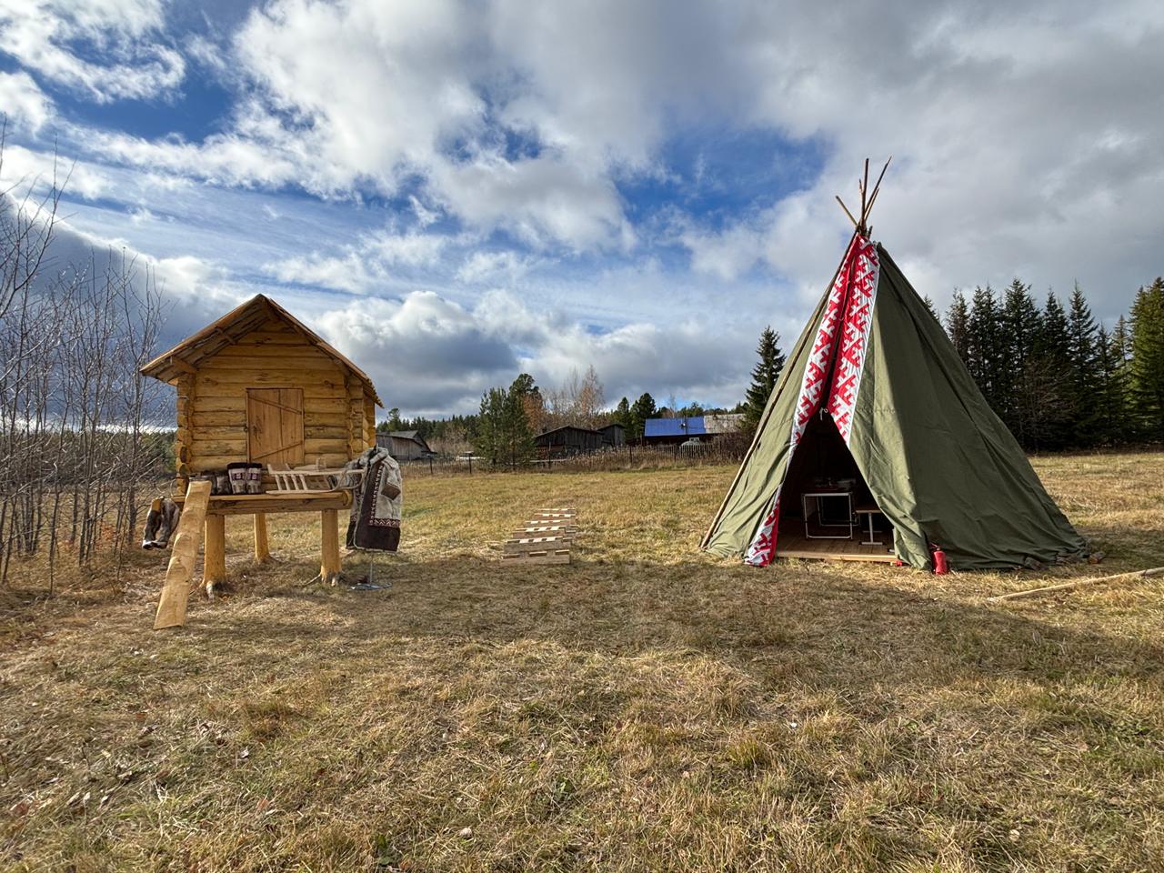 Неподалеку также расположен деревянный лабаз — небольшой сруб с двускатной крышей. В таких постройках раньше хранили продукты, охотничьи снасти и другую утварь.
