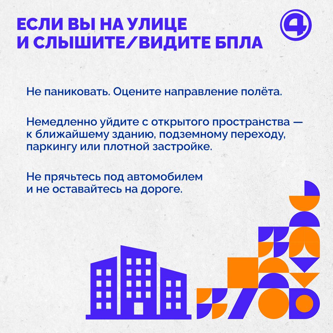 Самое главное — сохранять спокойствие и не паниковать. Если вы заметили в небе беспилотник, нужно срочно перейти в укрытие — выбрать помещение без окон, подвал или паркинг. На улице лучше спрятаться за плотной застройкой, деревьями или кустарником, избегать открытых пространств и не пользоваться лифтами.