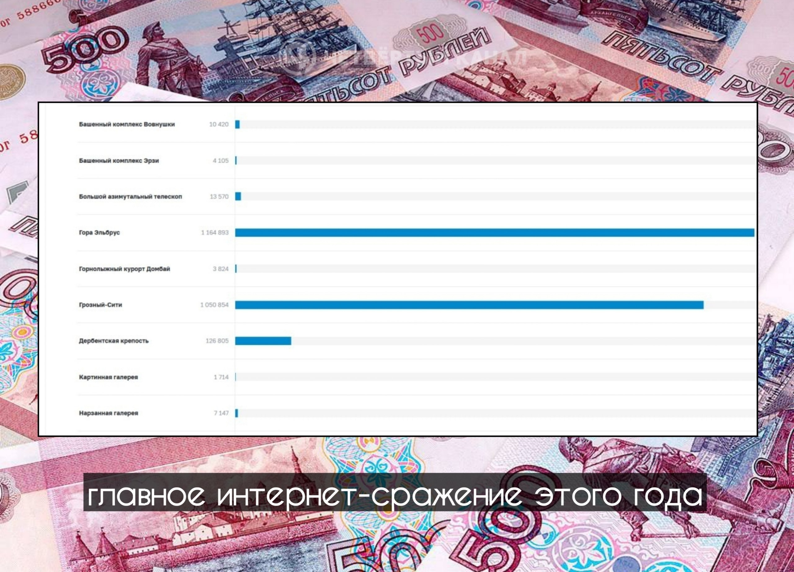 Ранее было запущено голосование за дизайн новой купюры номиналом 500 рублей. Гора Эльбрус пока уверенно лидирует, собрав свыше 1,1 млн голосов. Но «Грозный-Сити» дышит ей в спину, отстав всего на сотню тысяч.