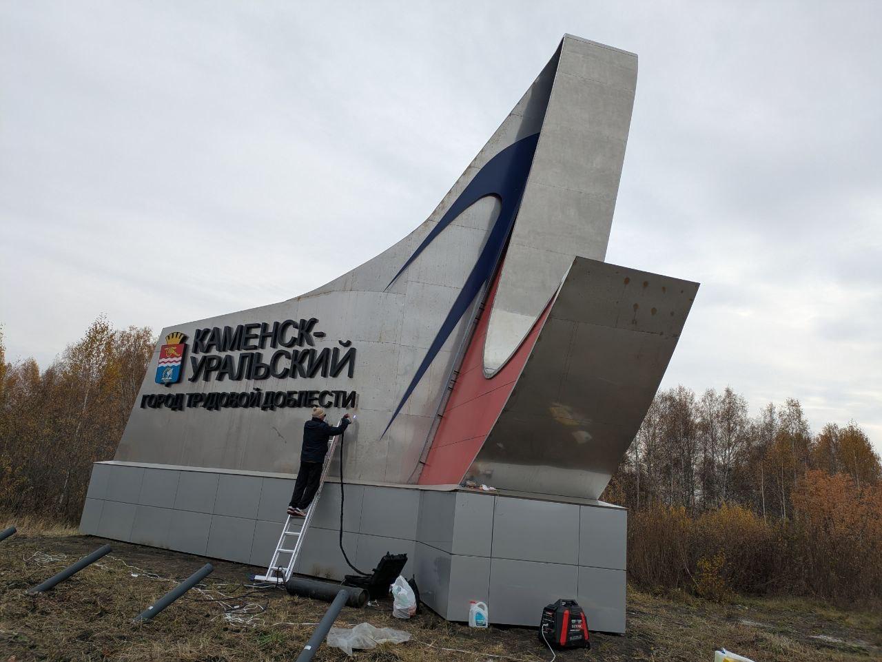 Стелу «Каменск-Уральский — город трудовой доблести» на въезде в город со стороны Екатеринбурга очистили от оксидного слоя и ржавчины. Все работы, в том числе покрытие специальным защитным слоем, подрядчик выполняет в рамках гарантийных обязательств