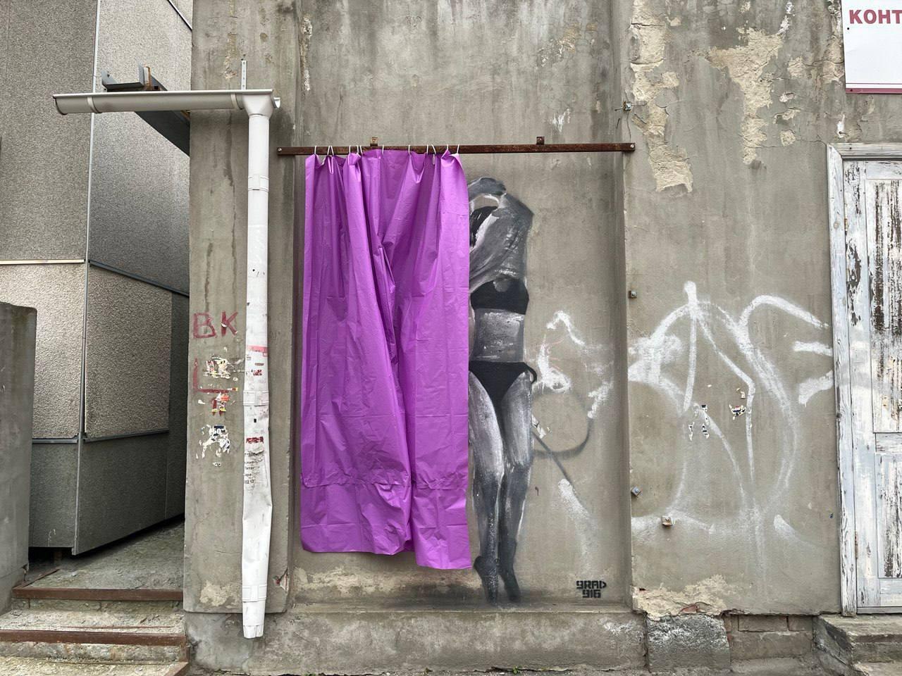 Художник Grad916 создал на Гагарина, 6 новый арт-объект — он изобразил посетителя пункта выдачи заказов во время примерки.