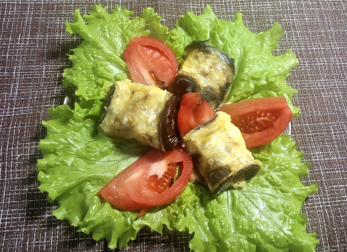 Как только начинки готовы, следует обжарить ломтики баклажанов без масла — достаточно просто подержать их на раскаленной сковороде, чтобы они стали мягче и легко сворачивались в рулетики. Каждый ломтик фаршируется и укладывается в подготовленный противень, смазанный растительным маслом.