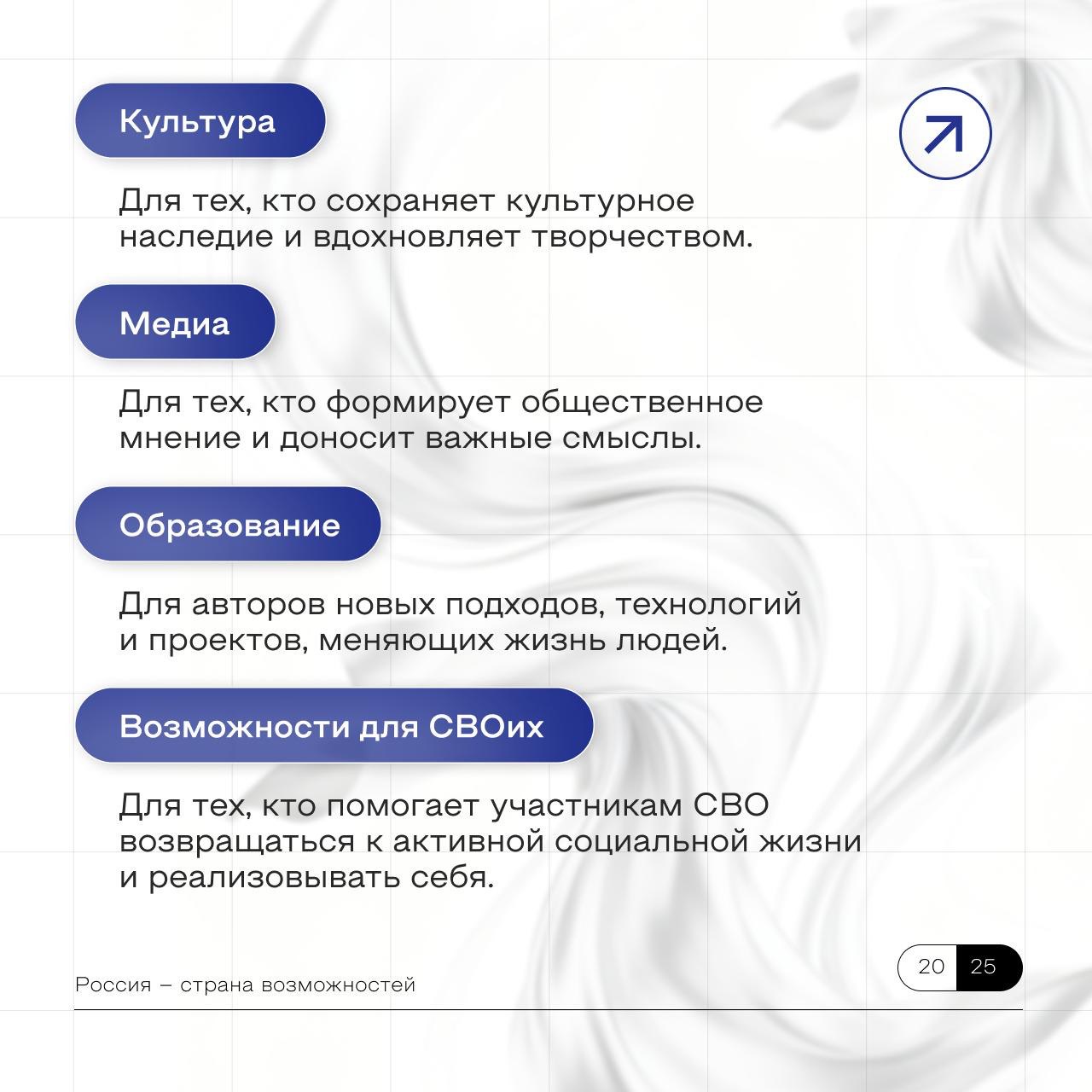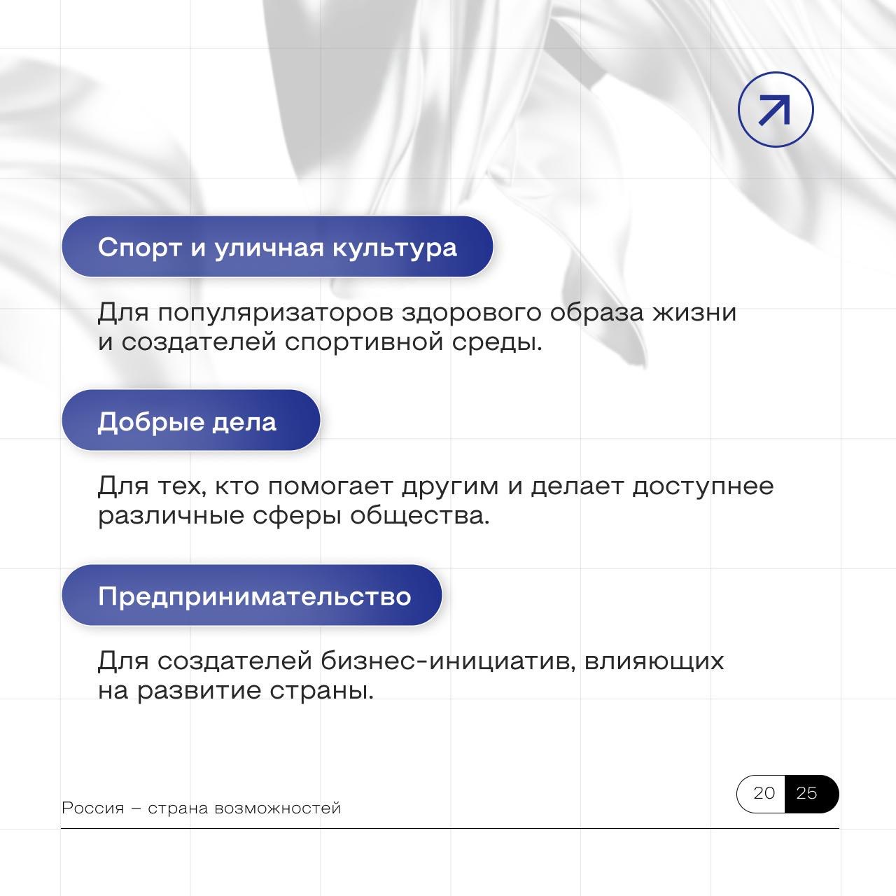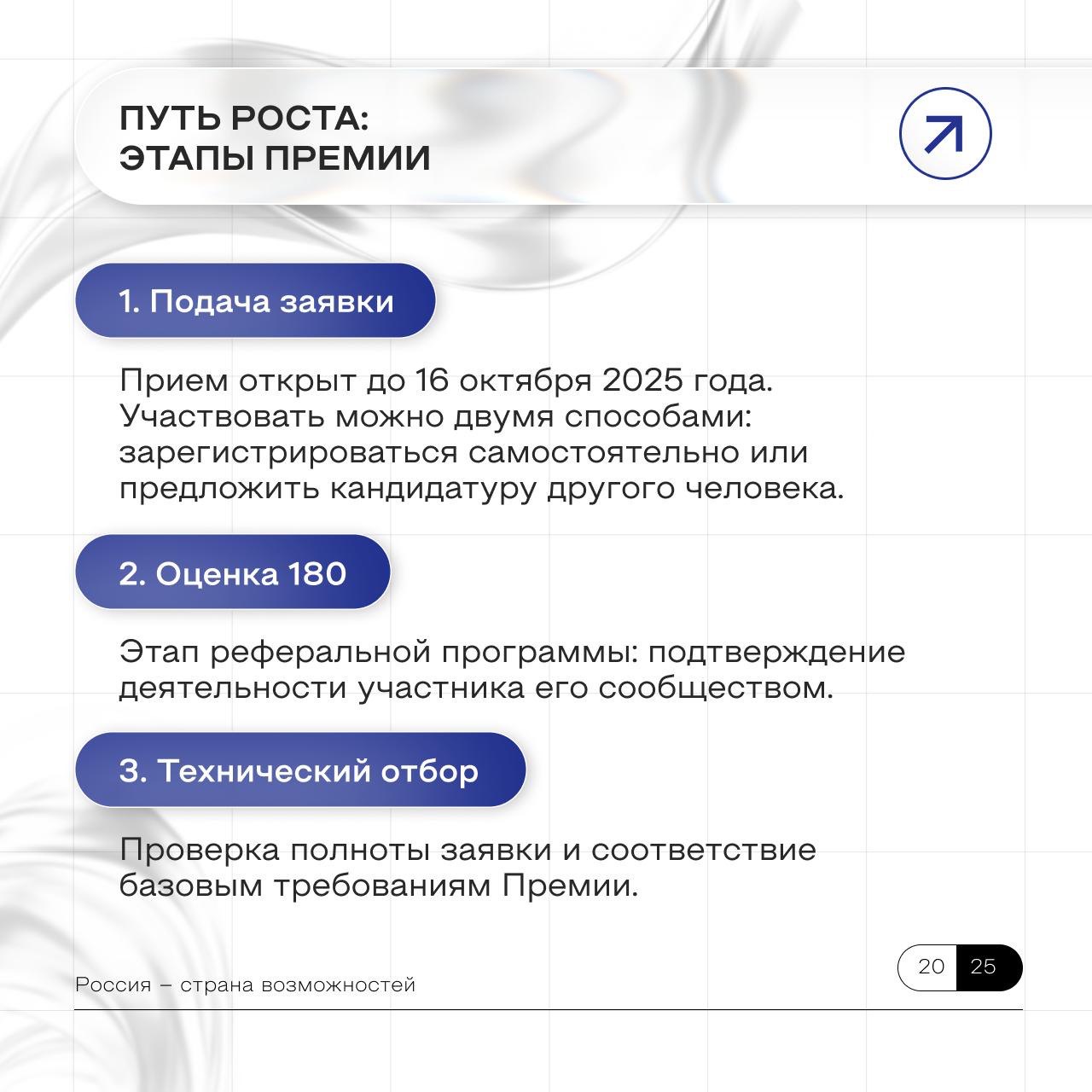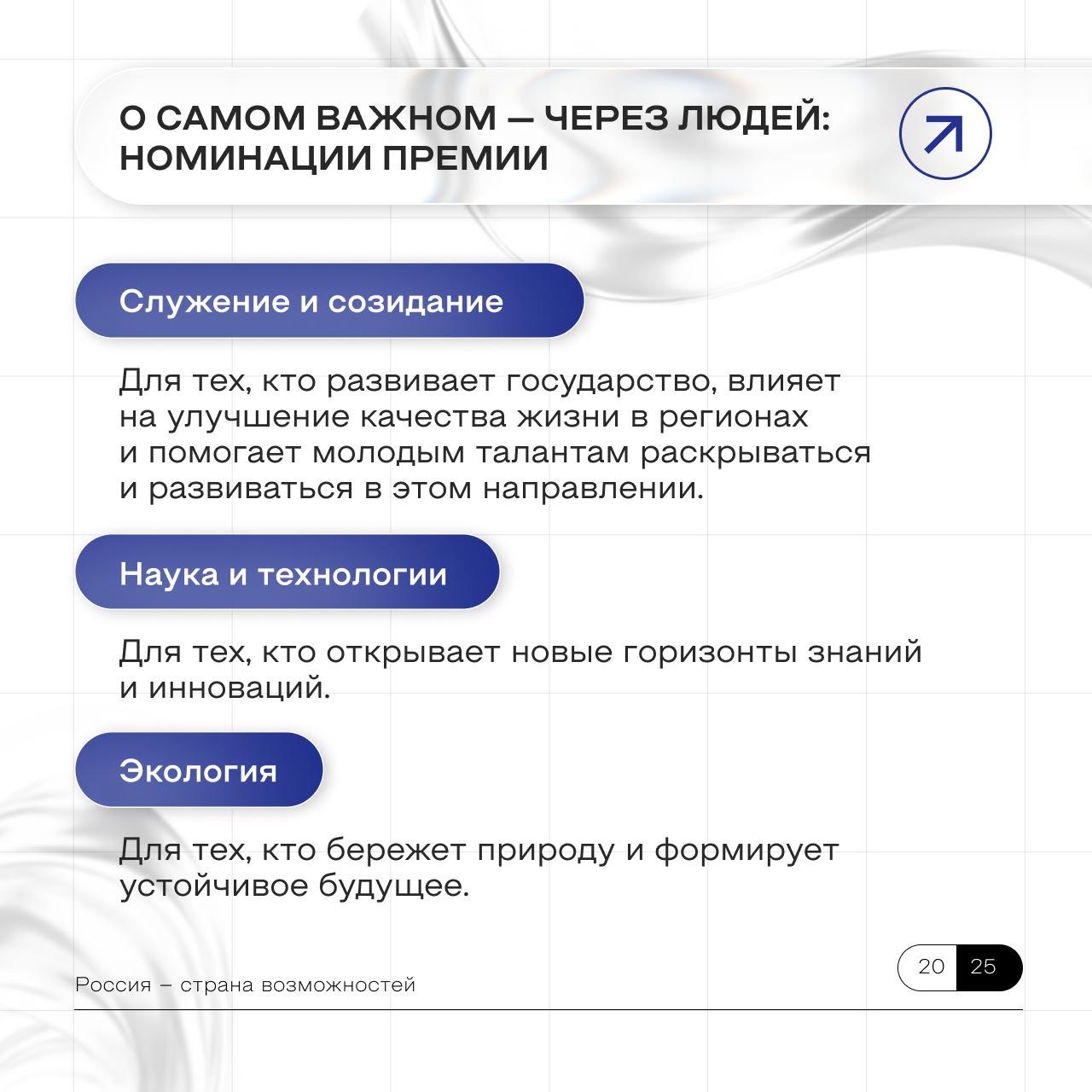 Премия поддерживает инициативных людей, которые своим примером вдохновляют других и формируют среду для развития талантов, инноваций и гражданской ответственности.