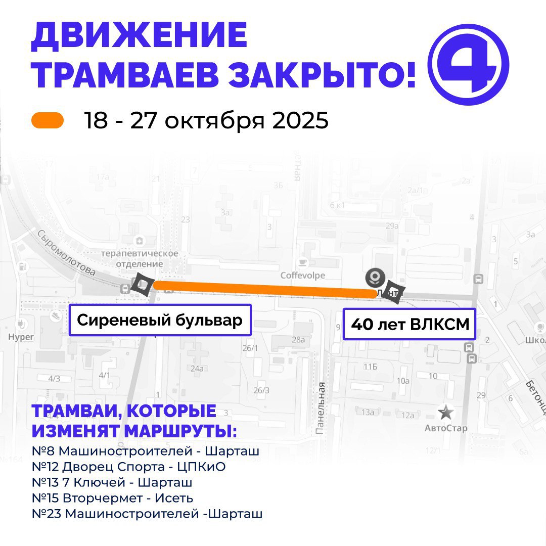 Трамваи №8, 12, 13, 15 и 23 изменят привычные маршруты и будут следовать в объезд. Как именно - смотрите в карточке.