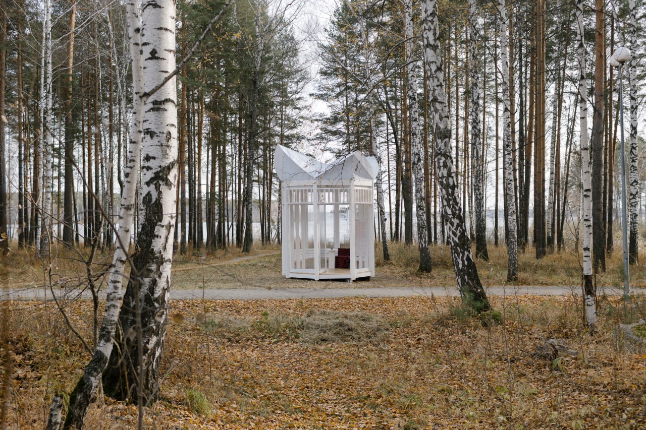 Художественный объект назвали «Теплица». Как рассказали его создатели, кровля беседки, которая напоминает раскрытое соцветие, с наступлением вечера загорается вместе с уличными фонарями.