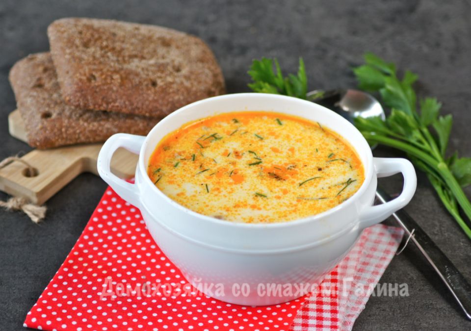 - Когда картофель станет мягким, вернуть в кастрюлю рыбное филе и овощную зажарку. В небольшой чашке смешать плавленый сыр с пастой Том Ям, растворив в горячем бульоне до однородной массы, и добавить в суп.