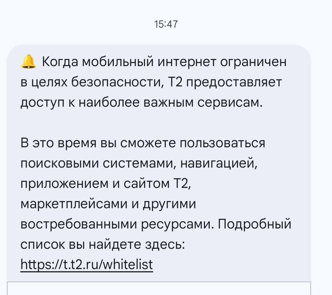 После падения WhatsApp* екатеринбуржцам также стали приходить СМС от операторов связи с предупреждениями об ограничениях мобильного интернета и списком сервисов, которые будут работать стабильно.