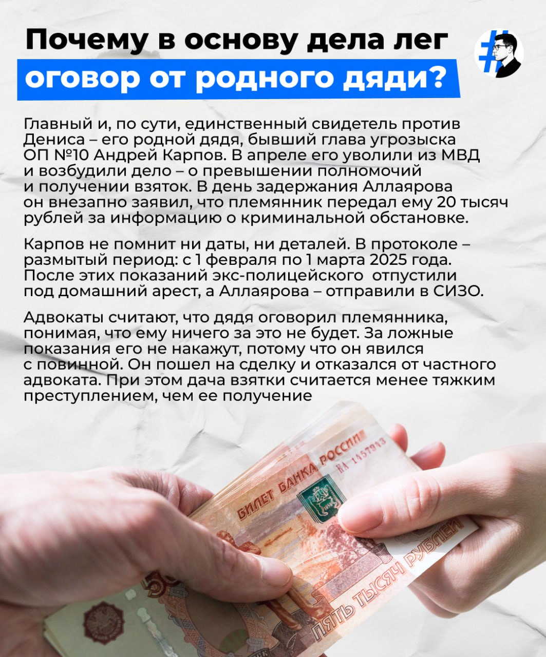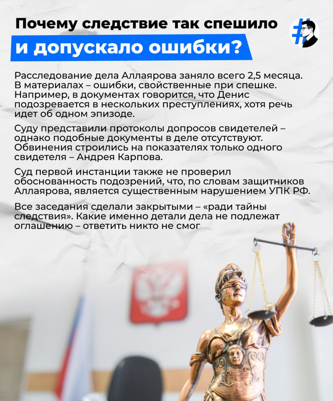 Сегодня начнется суд над Денисом Аллаяровым — ему грозит 8 лет за чужие преступления. И вот шесть вопросов, на которые нет ответа — читайте в карточках.