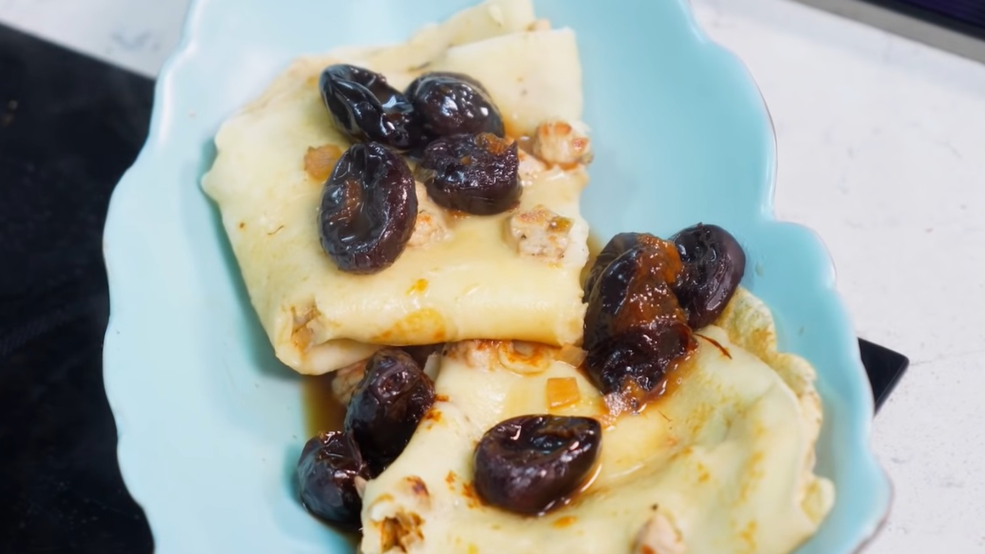 Выложить блинчики конвертиками на отдельной тарелке. Украсить черносливом. Оставшийся после сухофрукта в сковороде сироп налить сверху на блины.