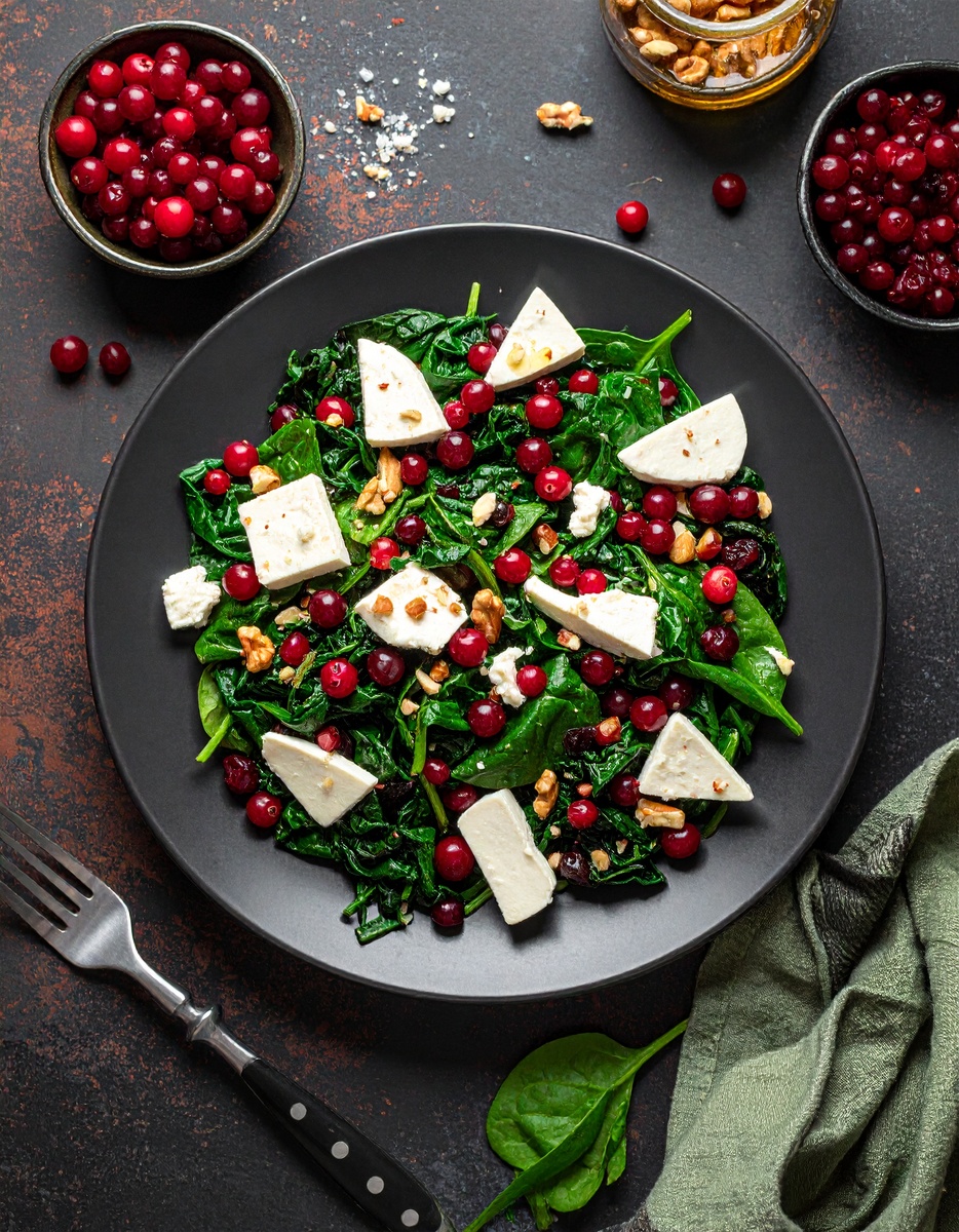 Клюква великолепно дополняет не только напитки и десерты, но и несладкие блюда. Одним из самых выразительных способов использования этой ягоды является тёплый салат с клюквой, шпинатом и козьим сыром. Это простое сочетание способно преобразить обыденный ужин.