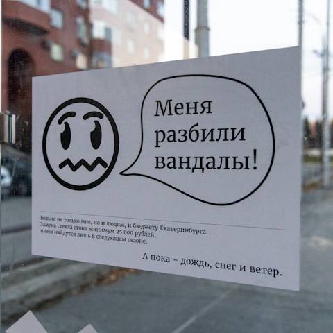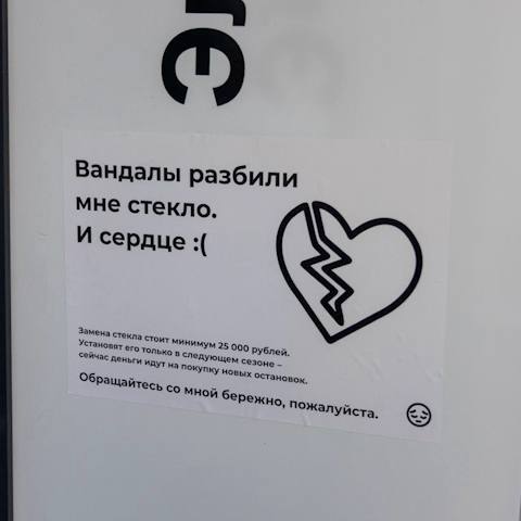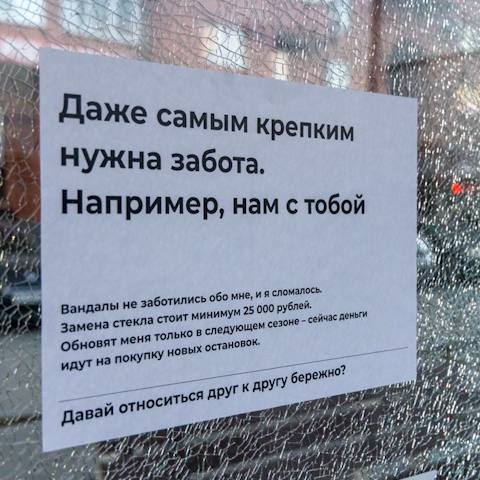 Жители пишут жалобы в мэрию, но хулиганов всё ещё не нашли. Власти говорят, что каждый раз обращаются в полицию, а толку нет. Чтобы хоть как-то защитить остановки, неравнодушные люди клеят на них грустные стикеры: "Даже самым крепким нужна забота".