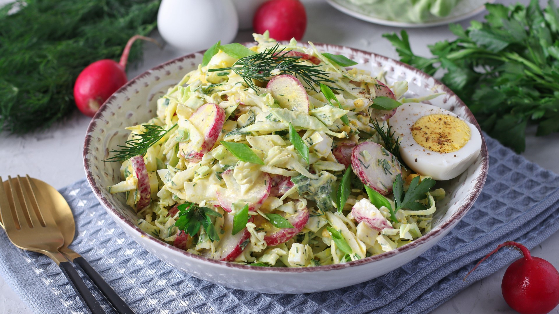 Диетические блюда вполне могут быть сытными и вкусными. Этот салат с капустой и яйцом оценят те, кто следит за фигурой. Он готовится за 5 минут и получается не хуже всеми любимых блюд с майонезом.