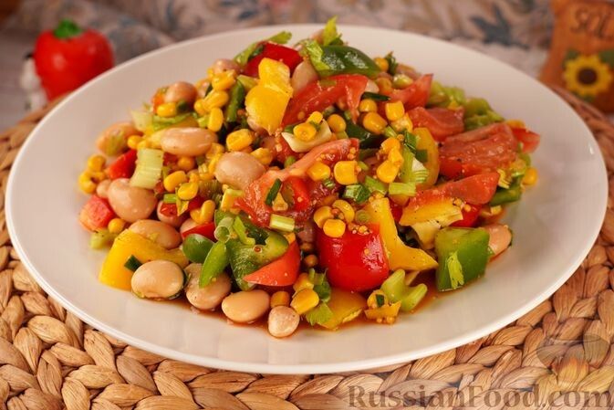 - Салат с фасолью, кукурузой и овощами — сочетание ярких ингредиентов, таких как сладкий перец и помидоры, делает этот салат не только полезным, но и эстетически привлекательным. Заправка из оливкового масла, соевого соуса и лимонного сока добавляет пикантности.