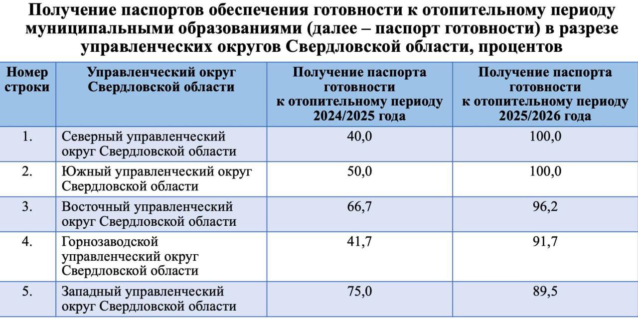 «Паспорта готовности получили 83 из 87 муниципалитетов, в то время как годом ранее — лишь 54 муниципальных образования. Сейчас проблемными остаются только Алапаевский район, Дегтярск, Кленовское сельское поселение и Верхняя Тура. Сравнивая с отопительным сезоном 2024/2025 года, когда паспорта готовности не смогли получить 38 муниципалитетов, мы можем говорить о большой проделанной работе, которая принесла свои плоды. Будем прилагать усилия, чтобы достигнуть 100% показателей в следующем сезоне», - отметил губернатор Свердловской области Денис Паслер.