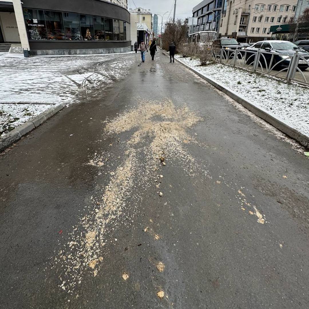 Это не кого-то стошнило в центре Еката — просто коммунальщики рассыпали смесь, которая, по их мнению, спасёт от гололеда.