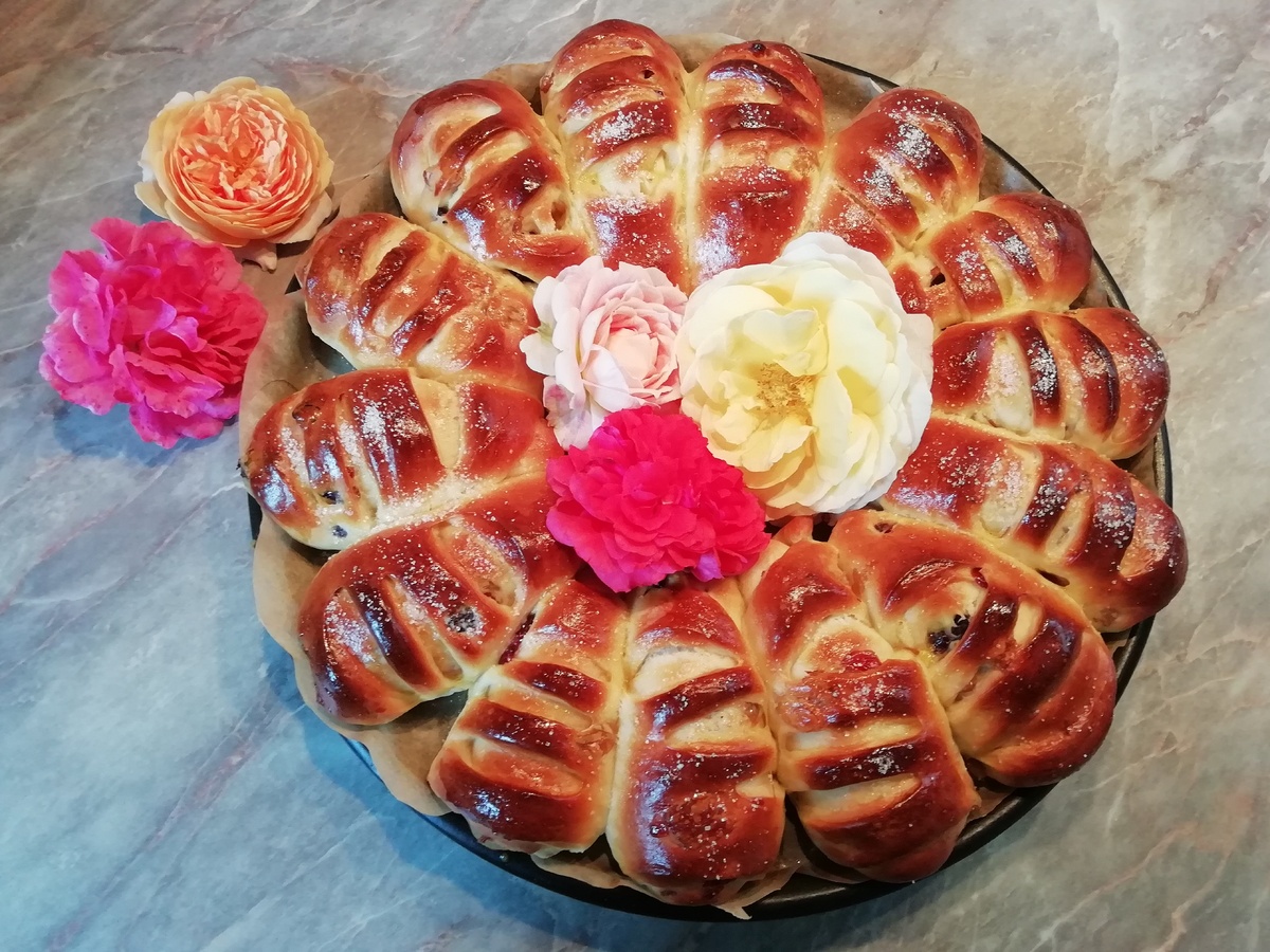 После того как булочки расставлены по кругу, их оставляют подходить еще на 20 минут. Перед выпечкой роллы смазываются взбитым яйцом, чтобы придать им аппетитный блеск. Пирог выпекается в разогретой до 180°C духовке на протяжении 25 минут.