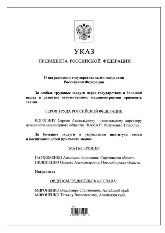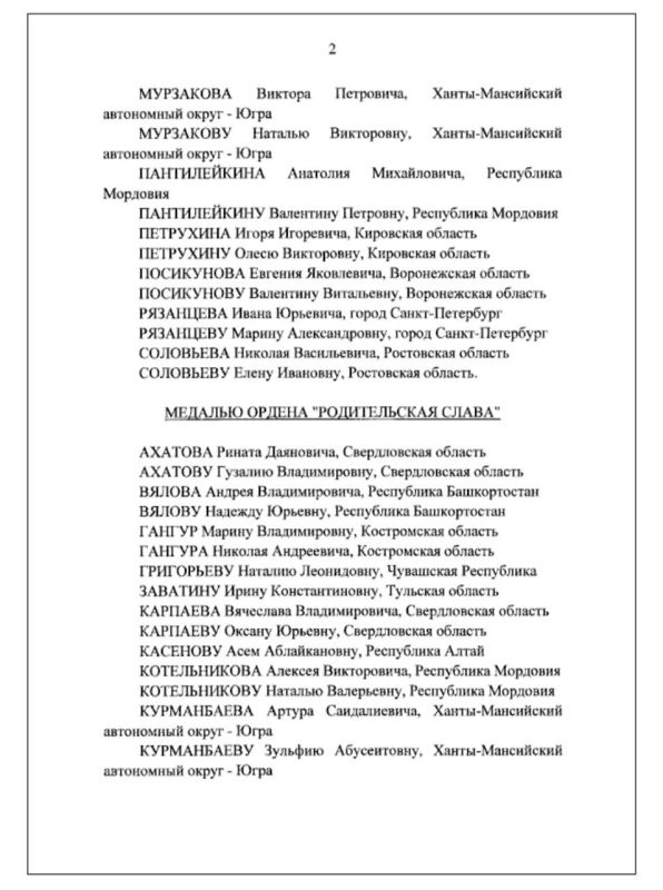 Этим же документом за большие заслуги в укреплении института семьи и воспитание детей присвоена Медаль Ордена «Родительская слава»: