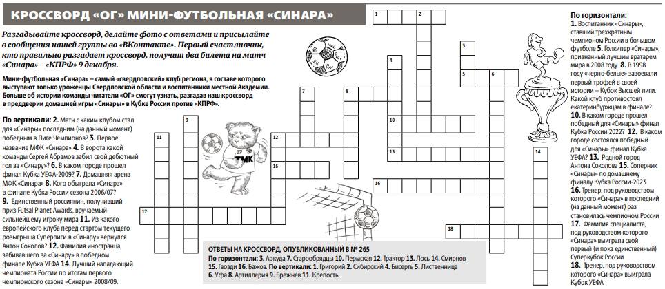 Первый счастливчик, кто правильно разгадает кроссворд, получит два билета на матч «Синара» – «КПРФ» 9 декабря.