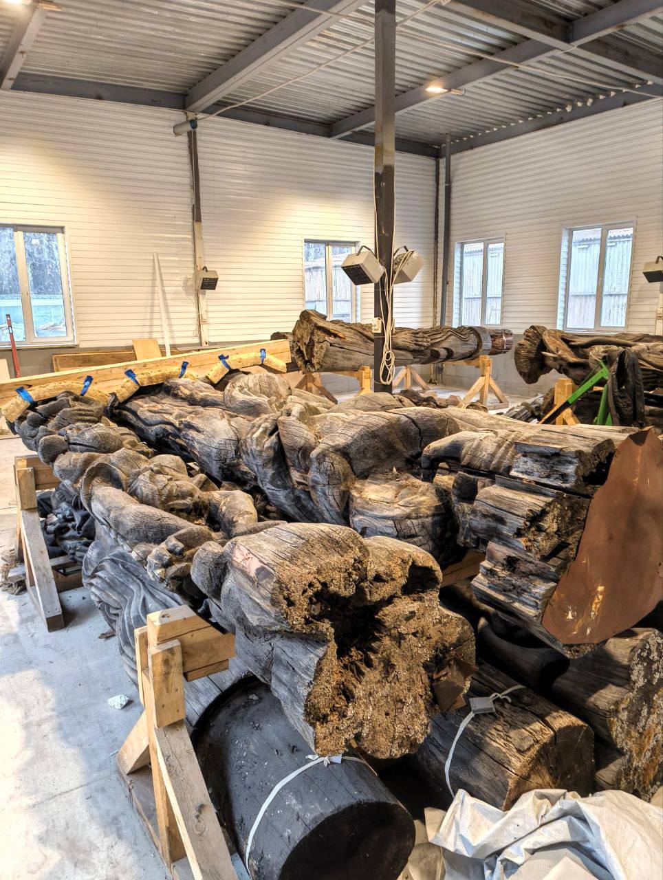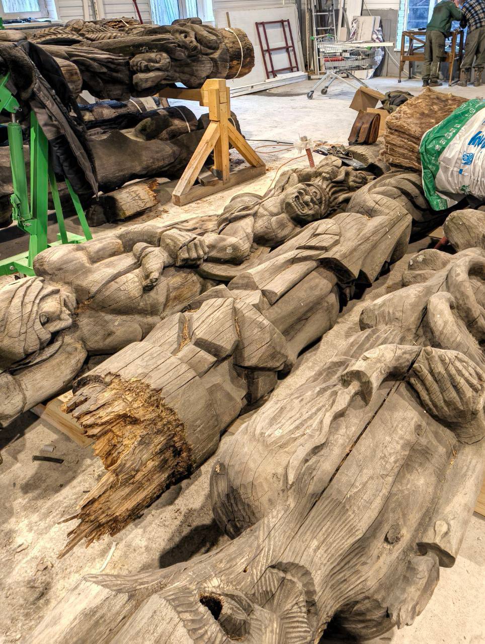 Сейчас 17 скульптур находятся в специальном ангаре, который поддерживает оптимальный для них температурный режим. Завершилась самая важная часть в подготовке к реставрации. Специалисты на нескольких фигурах проведут работы с использованием разных методик и подберут оптимальную. По планам, работы закончатся к августу 2026.