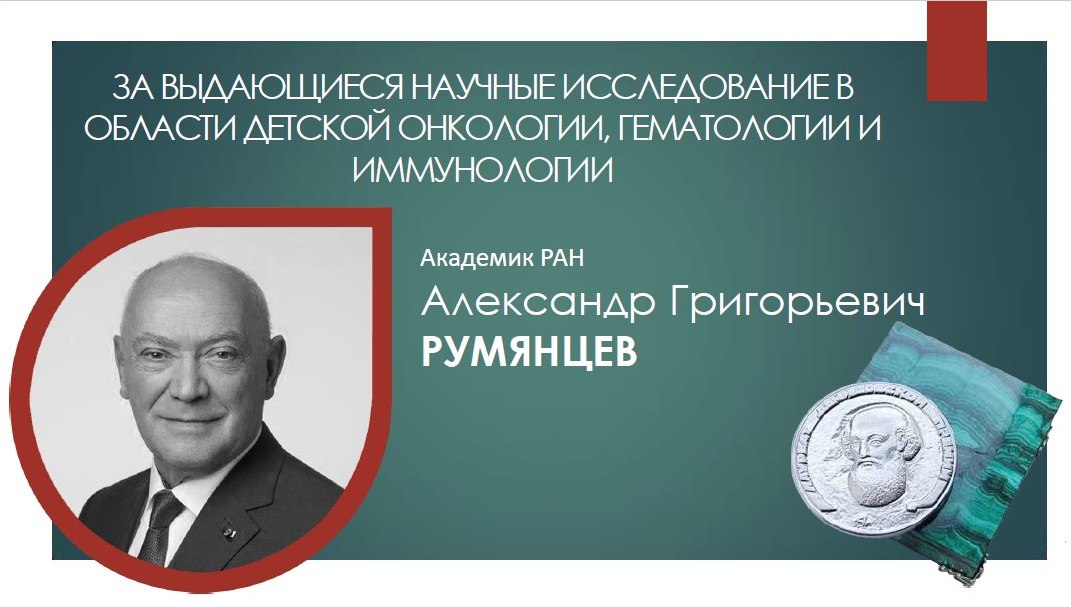 В номинации «Медицина» лауреатом стал академик РАН Александр Григорьевич Румянцев (Москва) — выдающийся ученый-педиатр, доктор медицинских наук, основатель и многолетний руководитель НМИЦ детской гематологии, онкологии и иммунологии им. Дмитрия Рогачева.
